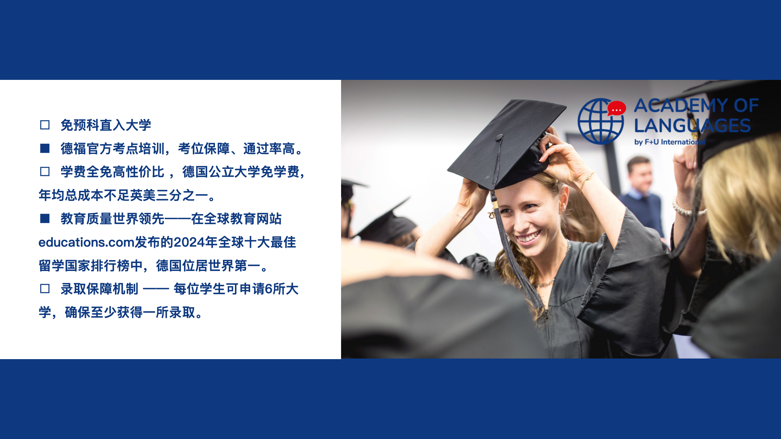 3. 安全稳定的留学环境 | 德国社会治安良好,医疗体系完善,学签政策透明,留学生享有与本国学生同等的法律保护与福利待遇。 |